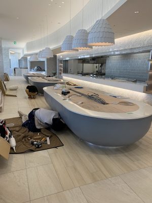 マリンメッセ福岡の工事では180人の左官職人が半年間施工に携わり、難易度の高いアール階段の施工もベテラン職人が担当しました。